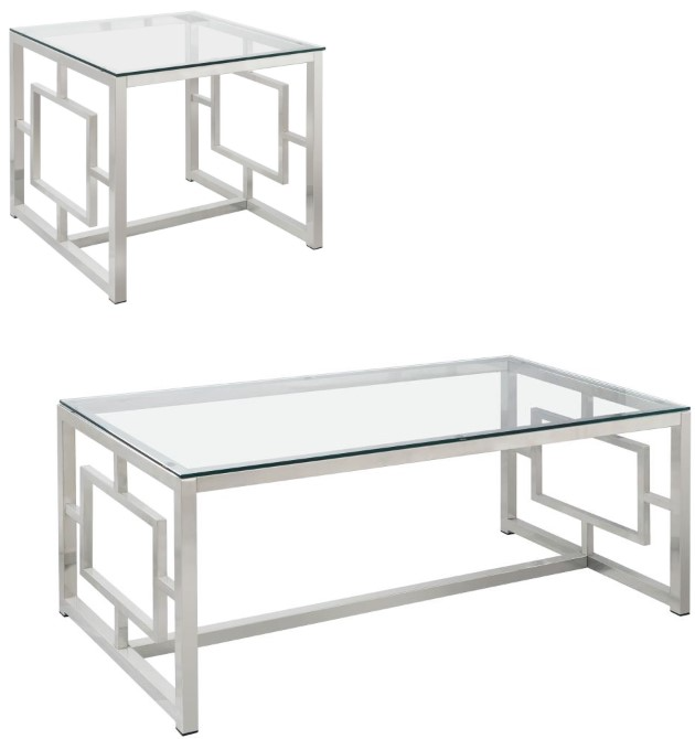 The Merced 2-piece Rectangular Coffee and End Table Set in Nickel features a sturdy nickel frame with spacious rectangular tops. This set combines functionality with a sleek, modern look, making it a perfect addition to enhance any living room while offering ample space for your essentials..Read More