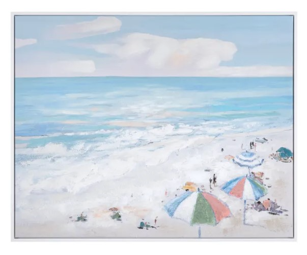 Colorful umbrellas dot the shoreline, creating a vibrant contrast against the soothing hues of the water and sand. This lively scene invites you to imagine yourself lounging under the sun, enjoying a refreshing drink while soaking in the warmth of a perfect day at the beach. A sleek white frame is the final touch on this picturesque painting, making it the perfect addition to any coastal-themed interior. Carefully mount the piece to your desired wall space with the two included, d-ring brackets.