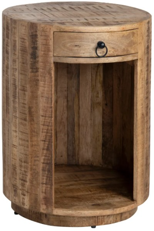 Its rounded barrel shape is not only visually appealing but also offers practicality with a single drawer and an open cut-out front for storage or displaying keepsakes.