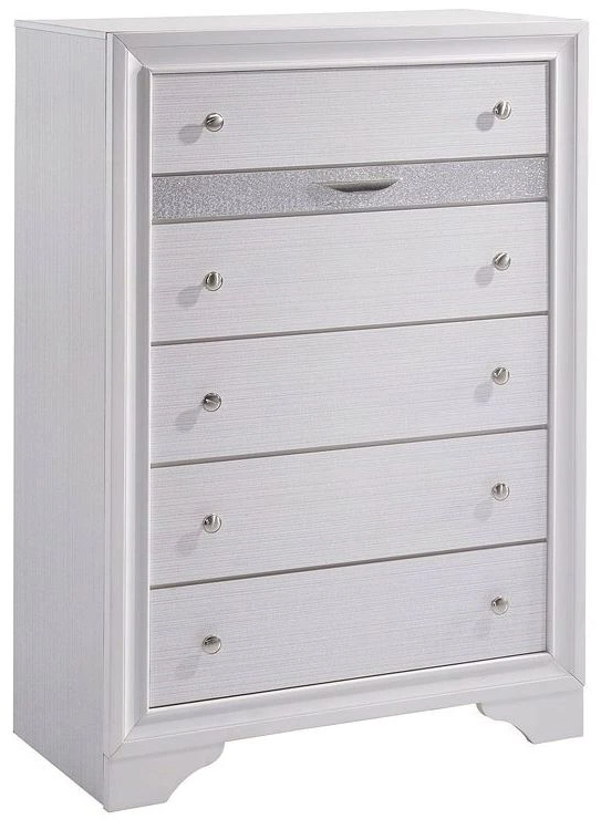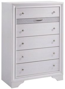 Brighten your room with the sheen and shine that this chest delivers. The gleaming white finishes promote a refreshingly clean aesthetic with silver lines that glisten in any light. Silver tone pulls detail the chest brilliantly. Glimmering and glamorous, create the room you have always dreamed of!