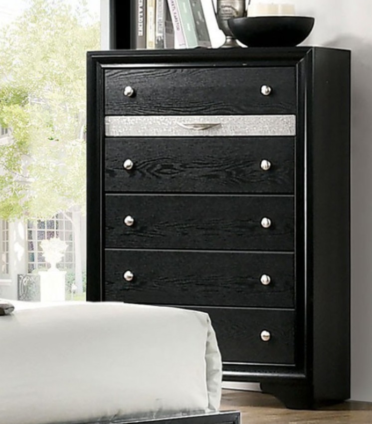 Brighten your room with the sheen and shine that this chest delivers. The gleaming finish promotes a refreshing clean aesthetic with silver lines that glisten. Silver tone pulls detail the case goods brilliantly, offering an easy grasp to the one-of-a-kind jewelry drawers. Glimmering and glamorous, create the room you have always dreamed of.