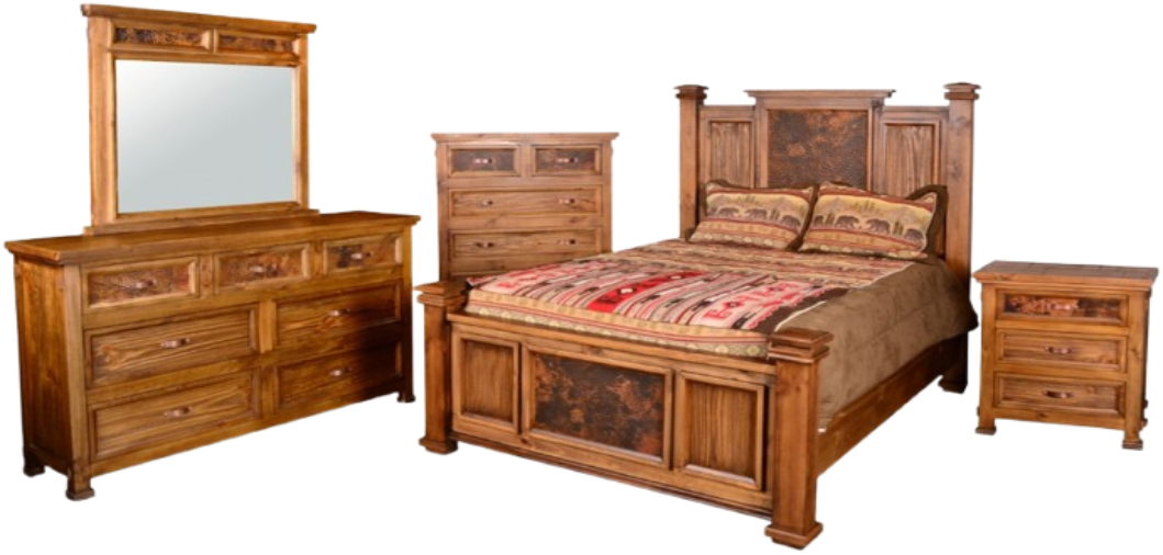 The Horizon Home® Copper Canyon 5-Piece King Mansion Panel Bedroom Set delivers luxurious the craftsmanship and rustic charm typical of the Añejo variation. This complete suite includes a king-size Mansion-style panel bed, a seven-drawer dresser with mirror, a chest, and a nightstand.Read More