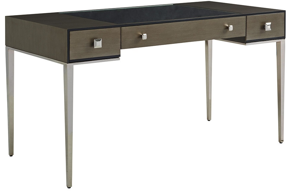 The wood top with mirrored glass insert sits on a platinum-finished stainless base. Two full-extension self-closing storage drawers flank a full-extension self-closing drop front keyboard drawer. Charcoal gray accents outline the top and glass insert.Read More