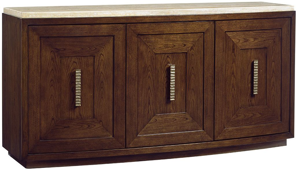 A signature piece, the buffet features three doors that frame custom pulls and a sweeping convex top of silver travertine. The left and center doors open to reveal a full extension drawer, felt lined and divided for silver, and five adjustable shelves for additional storage.Read More