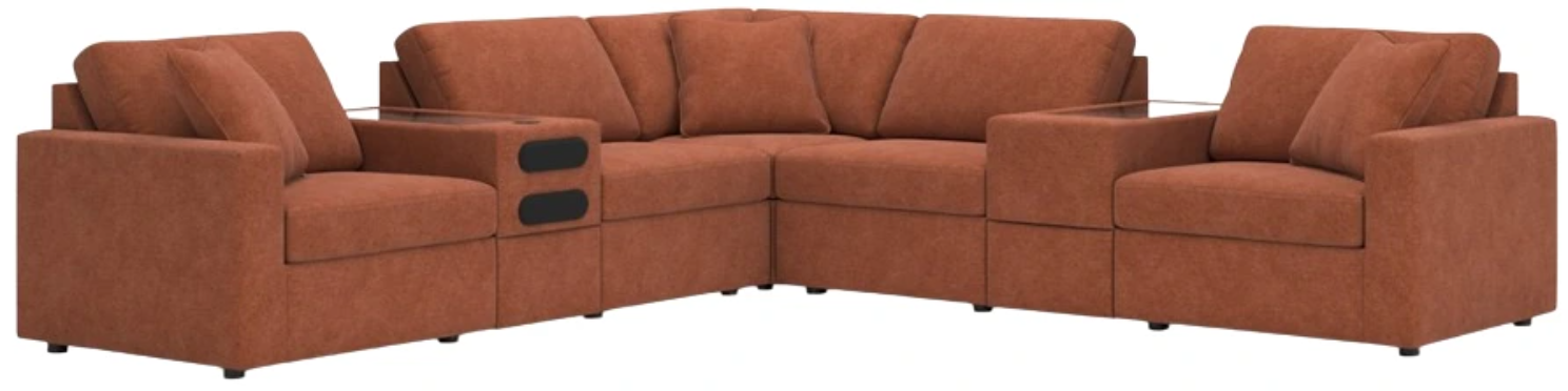 Includes 7 modular pieces: left-arm facing corner chair, audio console with storage, console with storage, wedge, 2 armless chairs and right-arm facing corner chair